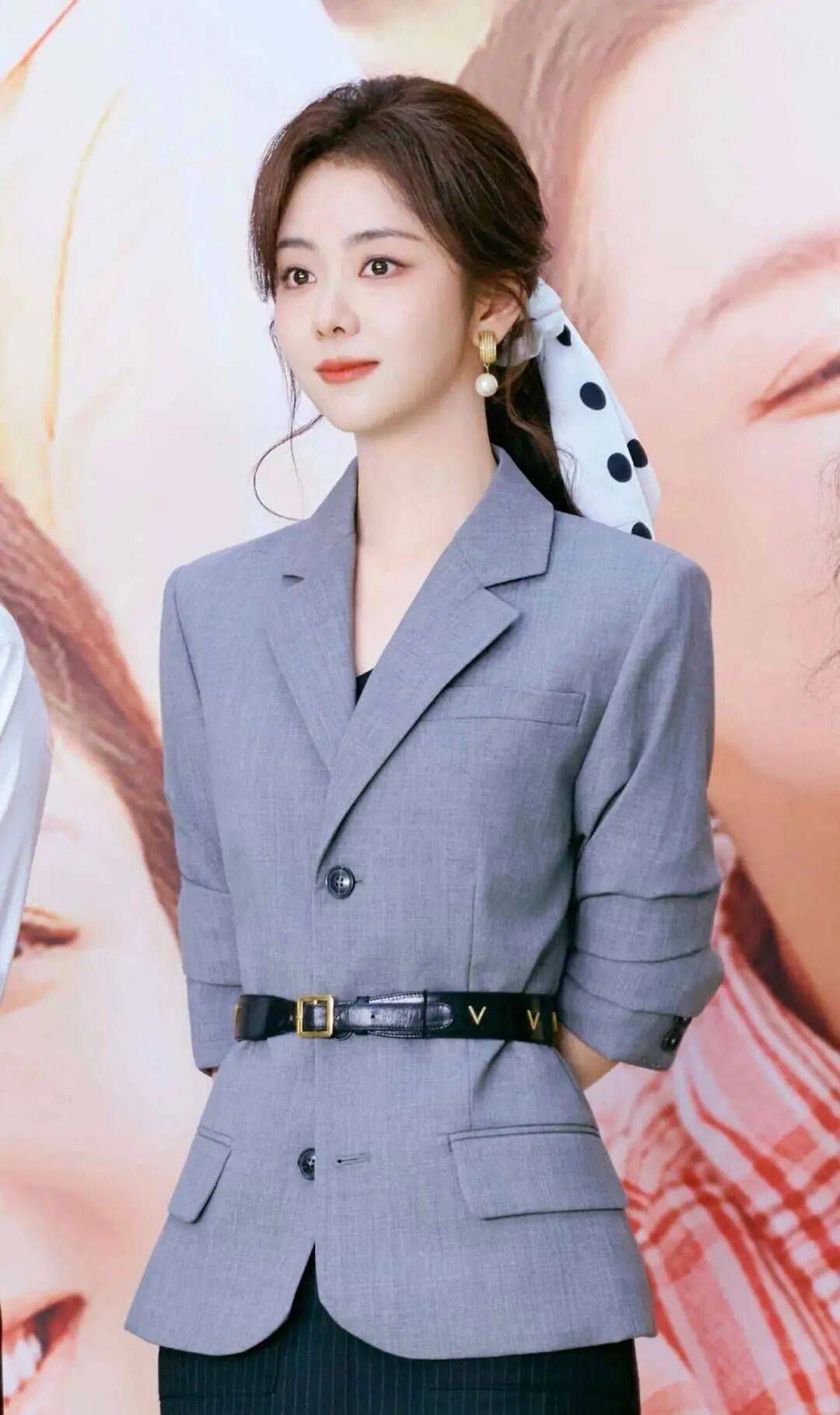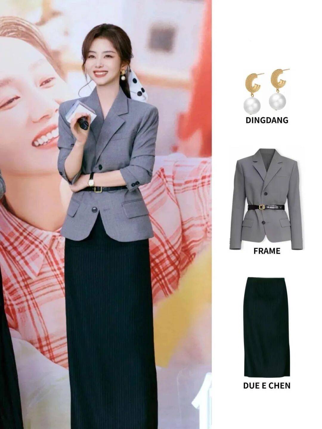 最值得借鉴的是谭松韵。灰色西装+长裙,带有一丝日系干练感,通勤穿着毫无问题,既不过于隆重又能彰显气质。